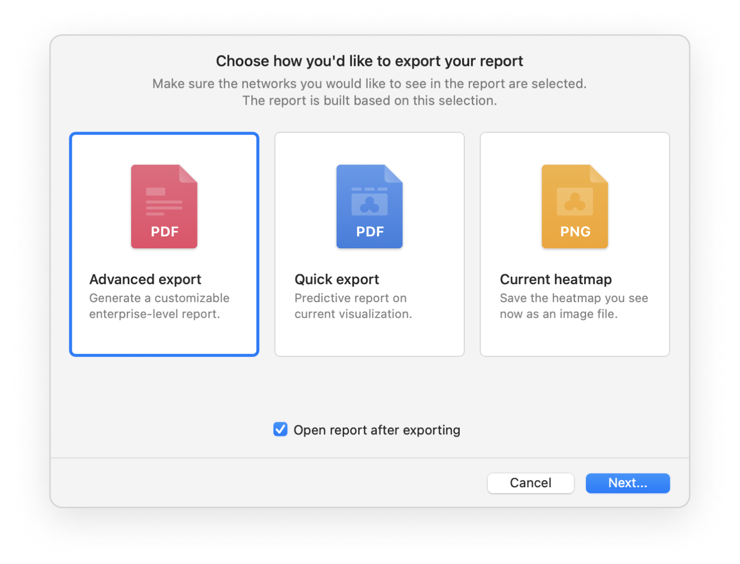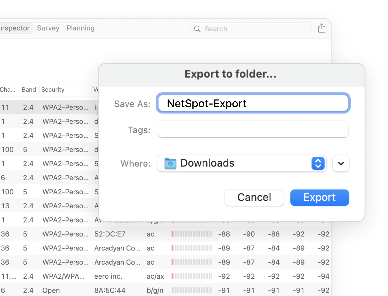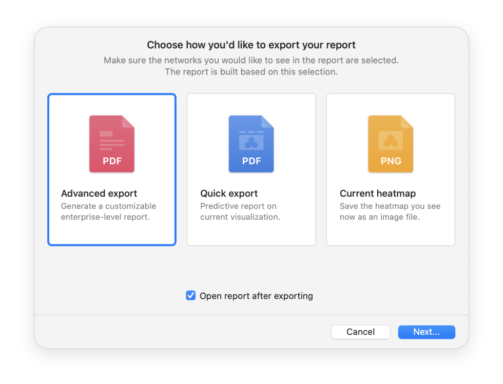 Export your WiFi site survey reports into one of the convenient formats and share them with others. Export to PDF or CSV is available.