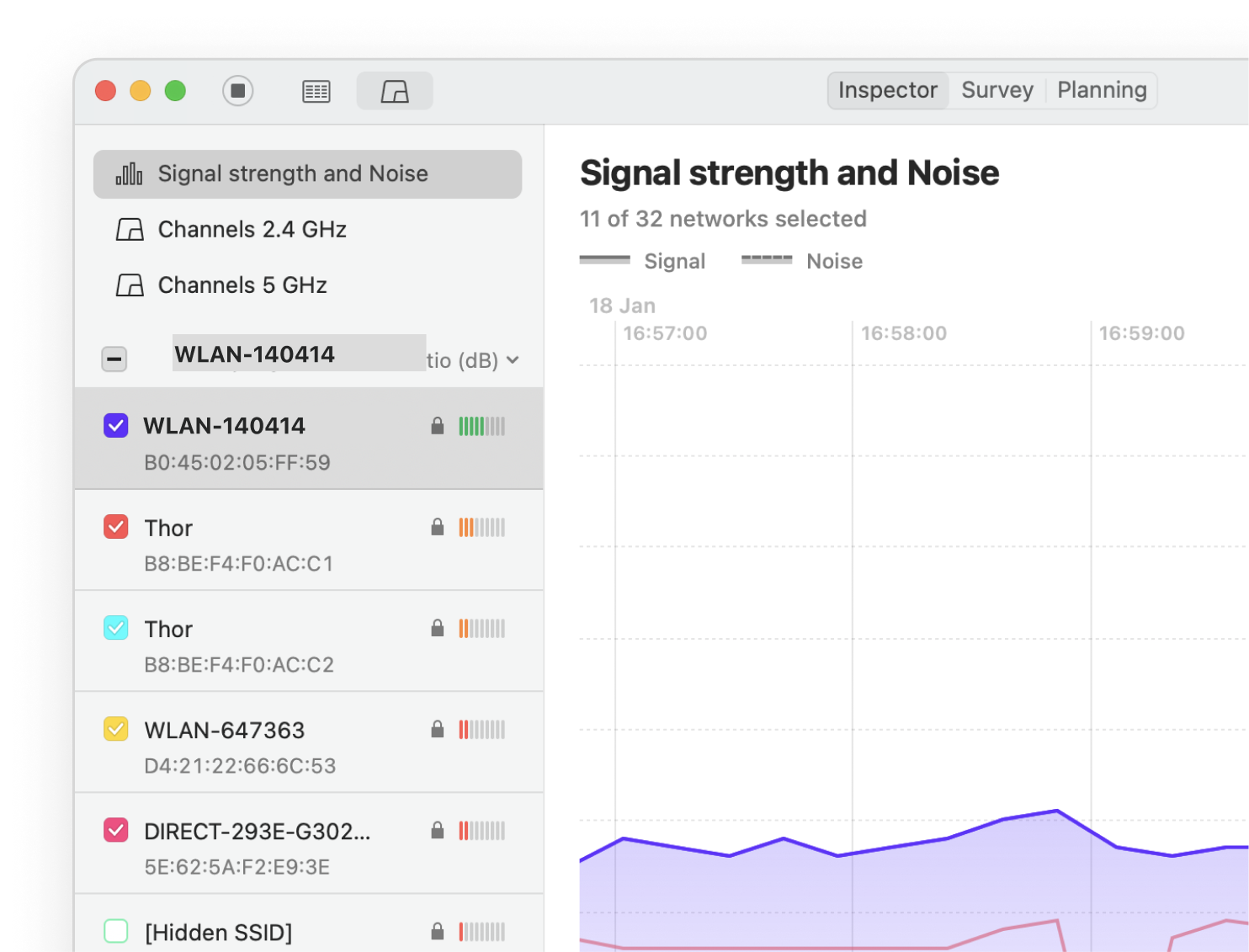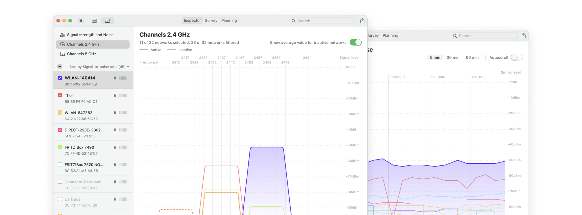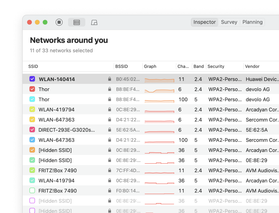 Collect live Wi-Fi data from all surrounding networks and quickly analyze them with the help of color-coded dBm data markers.