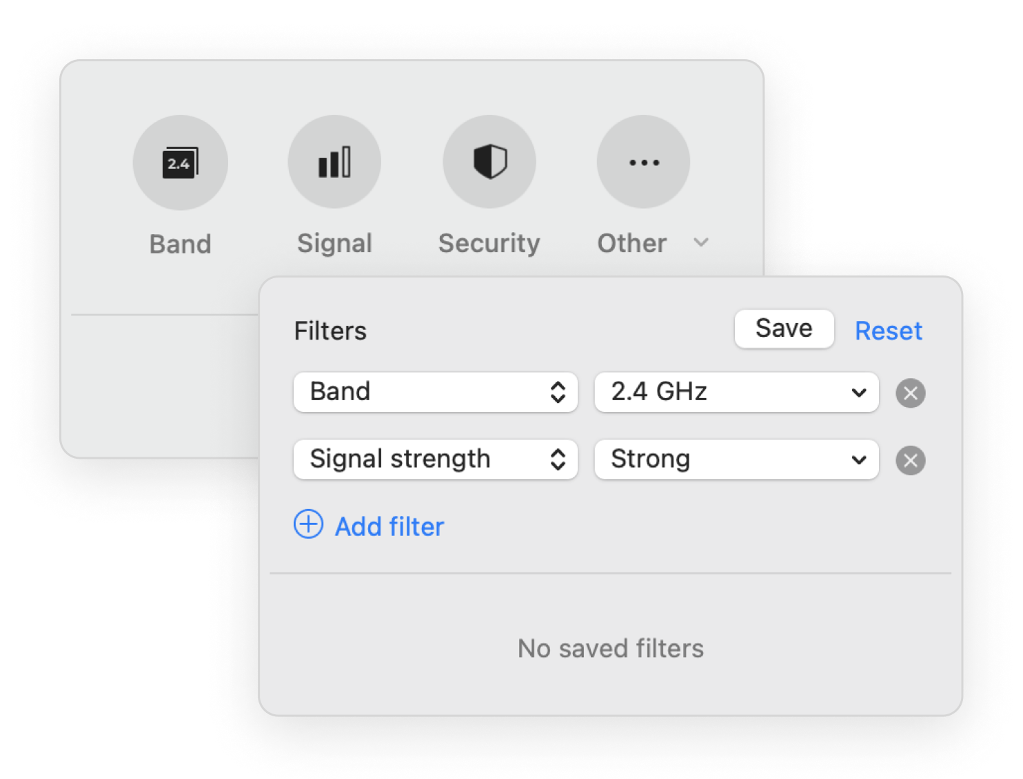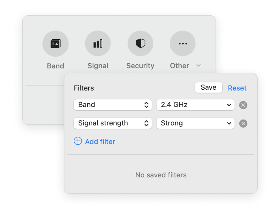 Find the needed network from many APs around you fast. Efficient filters allow you to quickly find networks with specified parameters.