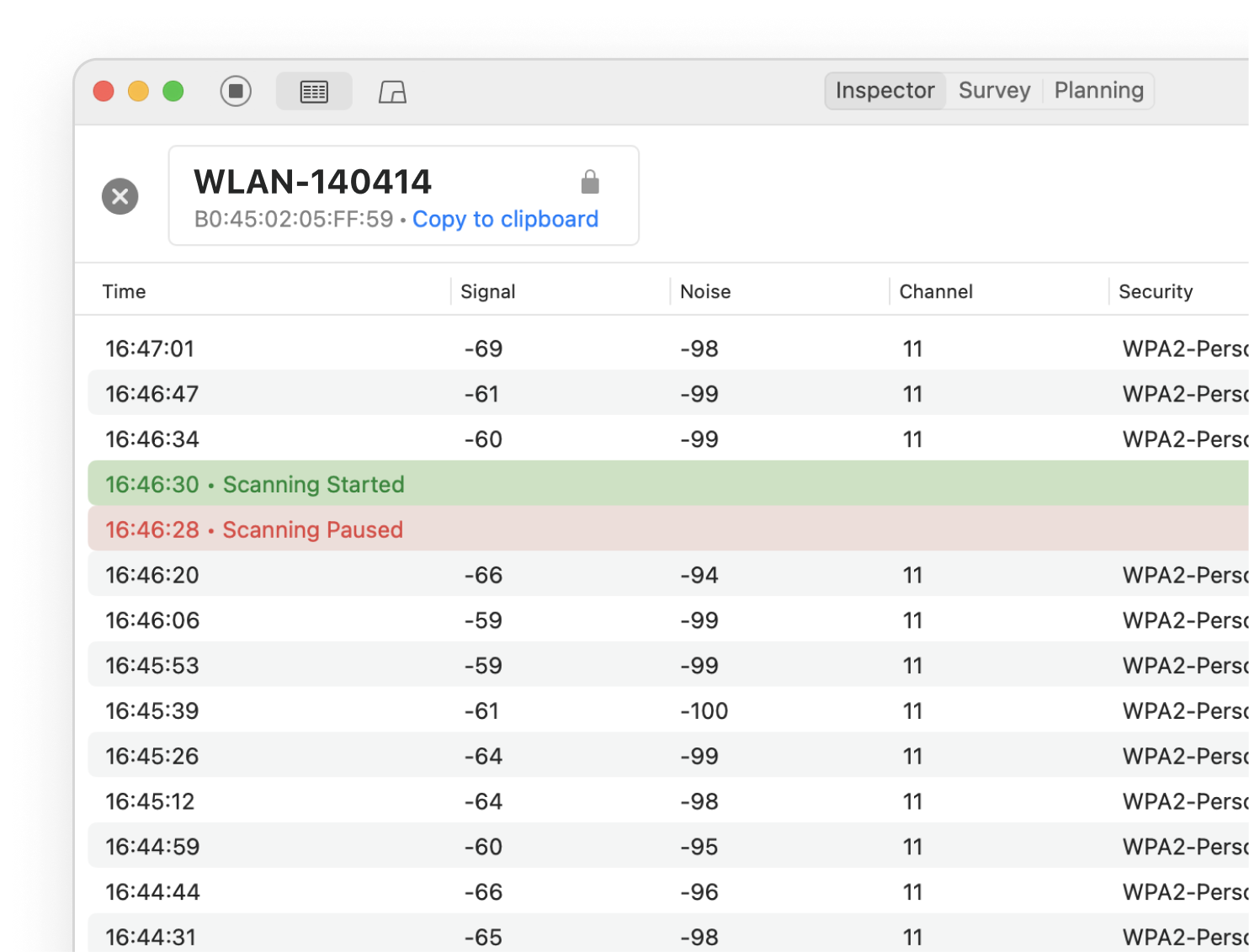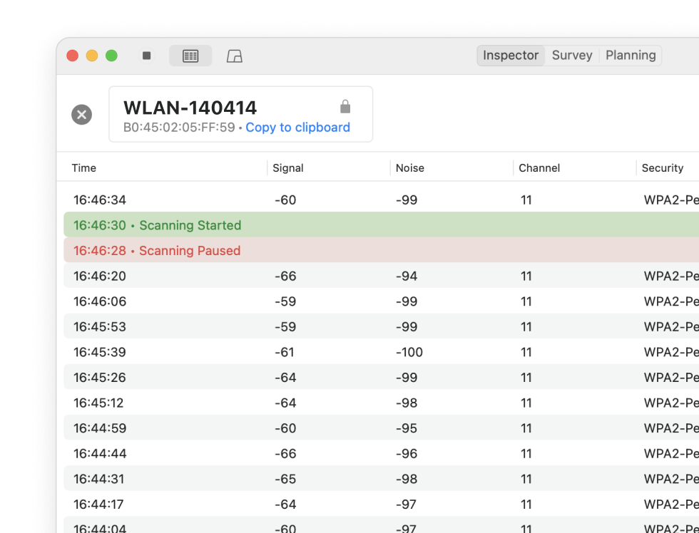 Inspector mode is ideal to locate Wi-Fi issues in a specific area. Save historical data per each AP for later review.