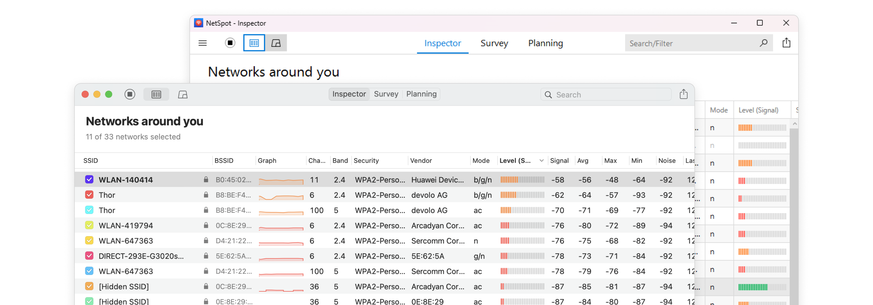 Easy navigation between comparison graphs. Customizable signal level and noise charts display changes in real time. Locate your busiest and least occupied channels.