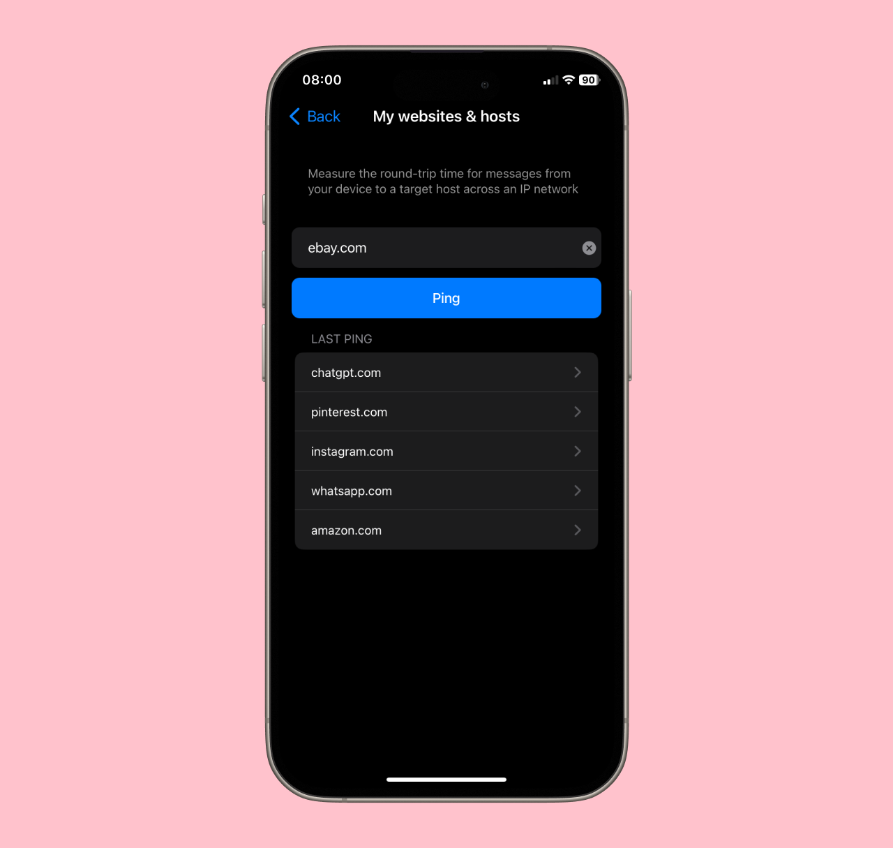 NetSpot already features a list of popular addresses for quick ping tests, however, you can test any address not on the list by using the “My websites & hosts” option.