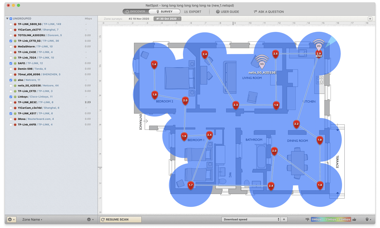 See how the 2.4GHz and 5GHz frequency bands are distributed throughout your space and where the signal might be missing altogether. Follow this link for more details.